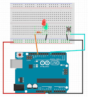 El siguiente paso en el montaje es añadir a lo que ya tenemos 2 LEDs, un botón y una resistencia. Antes de nada, asegúrate de que el cable USB está desconectado del ordenador.